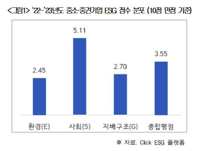 ESG 경영 수준을 점수화했을 때 10점 만점 기준으로 환경(E) 2.45점, 사회(S) 5.11점, 지배구조(G) 2.70점으로 집계됐다. 종합 평점은 3.55점으로 나왔다.