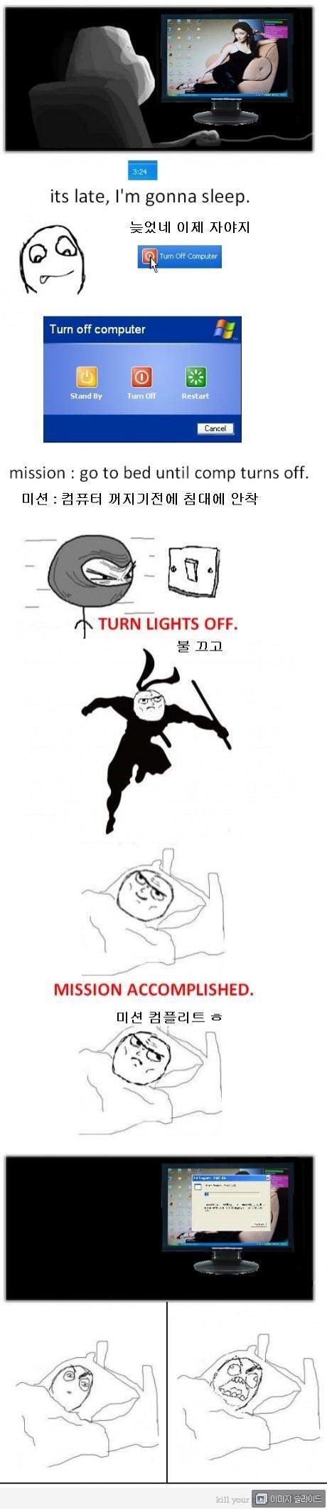 카툰 속 주인공은 잠자리에 들기 위해 컴퓨터의 종료 버튼을 클릭한다. 그는 컴퓨터가 꺼지기 전에 이불속으로 들어가야한다는 강박감에 재빨리 방의 전등을 끈 후 침대로 간다.