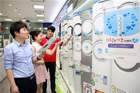 롯데하이마트는 에어컨 인기에 발맞춰 4차 고객참여형 사랑의 기부 이벤트를 진행한다. 삼성전자 에어컨 Q9000시리즈 17개 모델을 선정, 판매액 일부를 적립해 저소득층에 총 5000만원을 후원할 계획이다. 행사 모델인 삼성전자 에어컨 Q9000시리즈는 전면에 2~3개의 바람 토출구가 있어 상황에 따라 자유롭게 운전을 조절할 수 있는 모델이다. 토출구 1개만 사용해 냉방할 경우 전력 사용량을 최대 80%까지 줄일 수 있다.