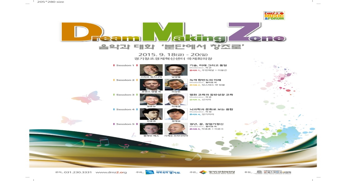 경기도에 따르면 오는 18일부터 20일까지 경기창조경제혁신센터와 임진각평화누리 음악의 언덕에서 융복합 문화예술 축제 'DMZ 2.0 음악과 대화'가 열린다. 이번 포럼은 테크놀로지·창조·평화 등을 화두로 21세기와 미래를 위한 지식을 논한다.