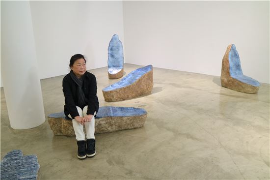 [아시아경제 오진희 기자] 바닥에 반짝 거리는 푸른 그림자. 사람이다. 어떤 건 상체가 세워져 있다. 기둥에 드리워진 것처럼. 흙으로 빚어 바다색을 입힌 그림자는 존재를 이야기한다. 살아 있는 모든 존재는 그림자를 갖는다.