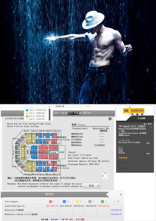 비 홍콩공연 티켓팅 / 사진=레인컴퍼니, HKticketing 사이트 캡처