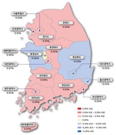 수도권(0.02%)은 지난주 대비 상승폭이 축소됐다. 서울과 인천 및 경기 모두 지난주 대비 상승폭이 줄었다.