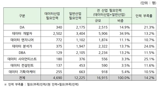 20일 미래창조과학부와 한국데이터진흥원이 내놓은 '2016년 데이터산업 현황 조사 주요 결과 요약'에 따르면, 국내에서 향후 3년내 추가로 필요한 데이터직무 인력은 총1만6915명으로 나타났다. 이 중 데이터사이언티스트와 데이터분석가의 부족률은 각각 25.1%, 24%로 가장 높게 나타났다.