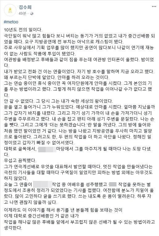 이어 김수희는 “많은 분이 제 얘기에 귀 기울여 주셔서 감사하게 생각하고 있습니다”라면서 “지금도 말 못 하고 고민하고 있을 많은 연극 동지들에게 괜찮다고 힘들어하지 마시란 말씀 전하고 싶습니다”고 밝혔다.