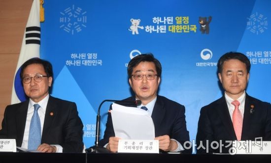 김동연 경제부총리 겸 기획재정부 장관이 15일 서울 세종로 정부서울청사에서 열린 청년 일자리 대책 관계부처 합동 브리핑에서 모두발언을 하고 있다. 왼쪽부터 김영주 고용노동부 장관, 유영민 과학기술정보통신부 장관, 김 부총리, 박능후 보건복지부 장관, 정현백 여성가족부 장관, 홍종학 중소벤처기업부 장관. /문호남 기자 munonam@