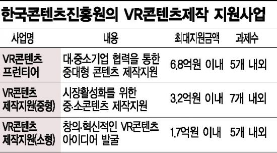 VR 수요가 늘어나는 데 발맞춰 정부도 지원분야를 다양하게 늘리는 등 대응에 나섰다. 콘텐츠진흥원은 지난해에 이어 올해도 VR 콘텐츠제작 지원사업 명목으로 VR 콘텐츠 프론티어와 함께 중형ㆍ소형 등 분야별로 나눠 지원과제를 선별키로 했다. 콘텐츠 프론티어는 대기업과 중ㆍ소기업간 협업으로 기획은 물론 제작ㆍ유통 등 전 단계에 걸쳐 지원하는 사업으로 이를 통해 VR 콘텐츠 성공모델을 새로 만들겠다는 구상이다. 중형 VR 지원사업의 경우 증강현실(AR)ㆍ혼합현실(MR) 등 차세대 기술기반의 콘텐츠를, 소형 VR은 창의적이고 혁신적인 아이디어를 발굴하는 등 각각의 특성에 맞춰 지원할 계획이다.