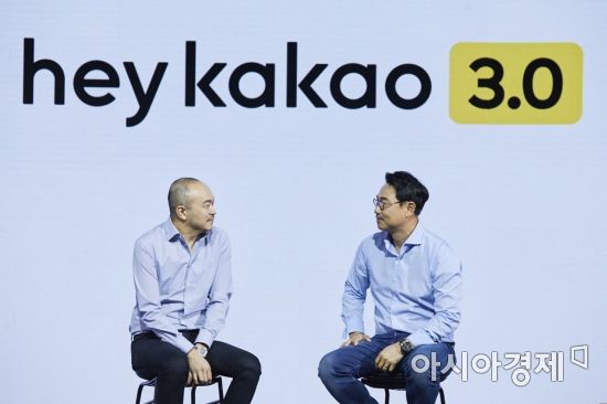 조수용(왼쪽) 카카오 공동대표와 여민수 카카오 공동대표가 27일 서울 중구 웨스틴조선호텔에서 열린 '카카오 3.0 시대 선언' 기자간담회에 참석해 취재진 질문에 답하고 있다./강진형 기자aymsdream@