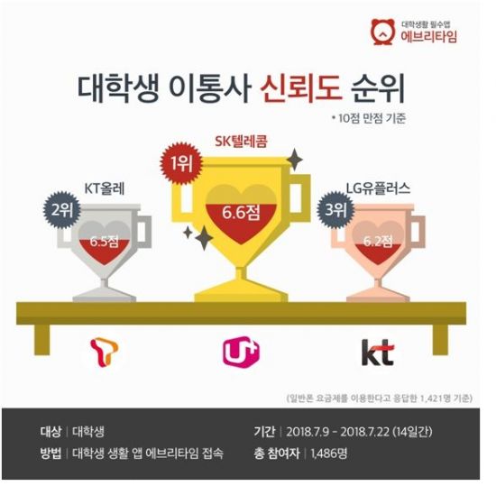 대학생들이 가장 많이 사용하고 있는 이동통신사는 SK텔레콤(44.5%)으로 나타났다. 또한 사용자 신뢰도(6.6점)에서도 3대 이동통신사 중 가장 높은 점수를 보였다. KT는 사용률 35%·신뢰도(6.5점), LG유플러스는 사용률 20.4%·신뢰도(6.2점)을 기록했다. 5:3:2 구도가 대학생 시장에서도 유지된 셈이다.