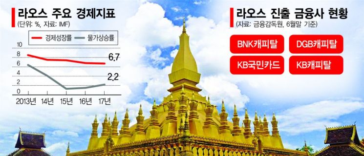 ◆자동차 금융 '금맥' 캔다 = 현재 라오스에는 BNK캐피탈, DGB캐피탈,KB국민카드, KB캐피탈 등 여신금융사 4곳이 진출해 있다. 국내 금융사들이 라오스 시장에서 가장 주목한 것은 '자동차금융' 시장이다. 라오스는 현지 자동차리스 시장이 연평균 13%씩 성장하고 있다. 신차와 중고차에 붙는 세금이 같아 국민들은 새 차를 선호한다. 국민소득 대비 자동차 구입비가 10배에 달하지만 구매욕구는 높은 편이다.