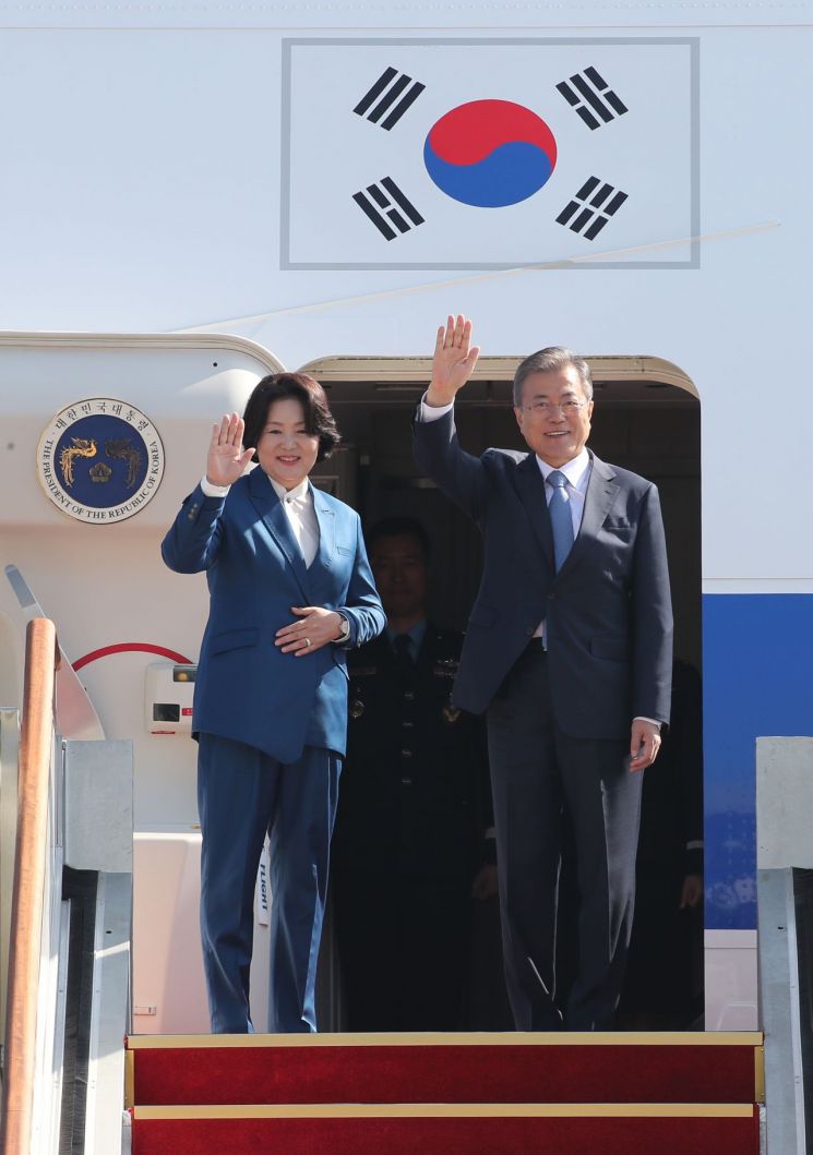 문재인 대통령 내외가 지난 13일 오전 경기도 성남 서울공항에서 유럽 4개국 순방을 떠나기 위해 공군 1호기에 오른 뒤 손을 들어 인사하고 있다./사진=연합뉴스