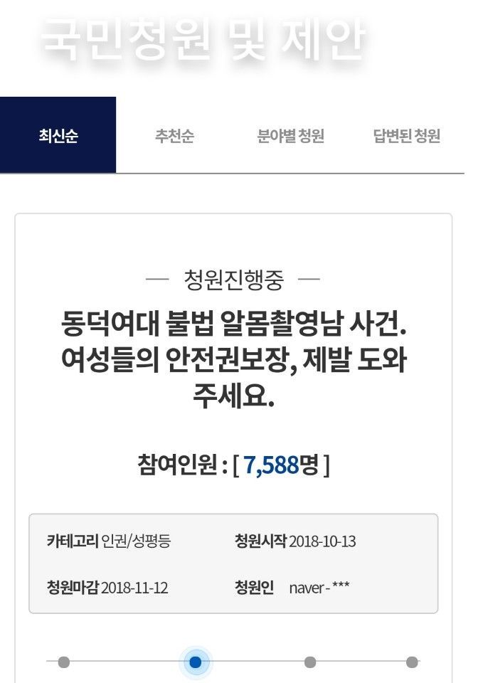 이같은 사실을 파악한 재학생들은 13일 트위터 해시태그를 이용해 여대 내에 외부 남성이 침입하여 음란행위를 한 사건을 공론화 하고, 청와대 국민청원 게시판에 동덕여대 내에서 노출 사진을 찍은 남성에 대한 처벌을 요구하는 청원을 게시했다.