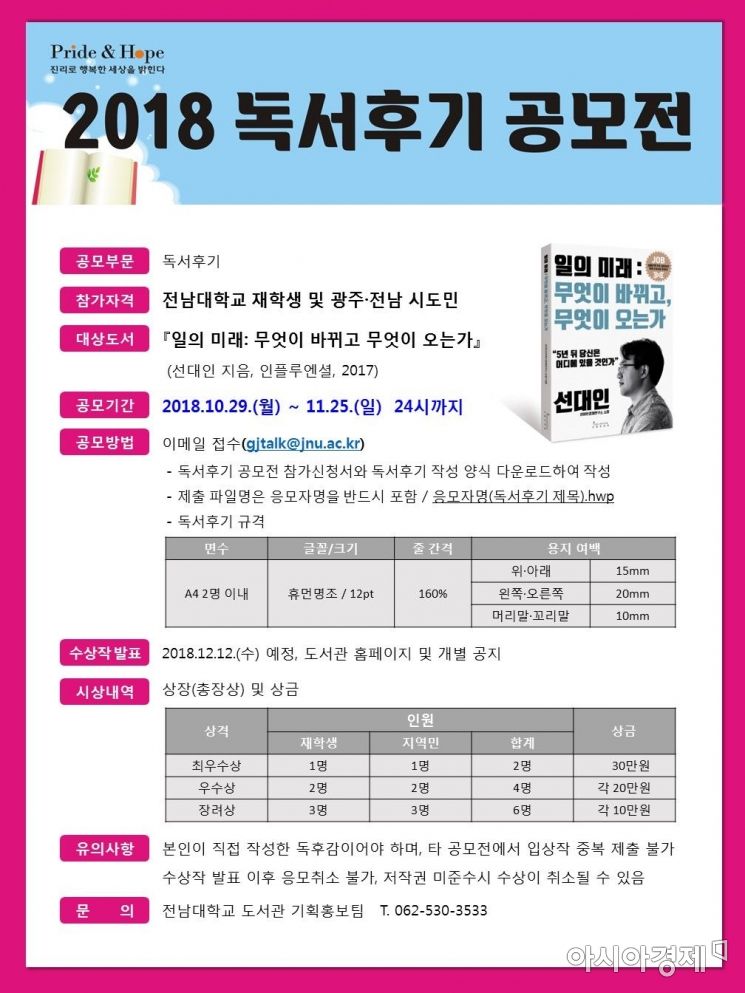 [아시아경제 호남취재본부 김춘수 기자] 범 시·도민 독서운동 ‘2018 광주·전남이 읽고 톡 하다’를 진행하고 있는 전남대학교가 오는 11월 25일까지 ‘독서후기 공모전’을 갖는다고 밝혔다.