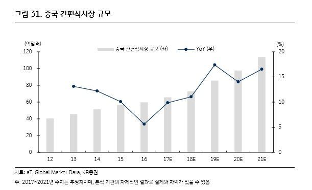박애란 KB증권 연구원은 "국내 간편식시장도 2010년에는 7747억원 규모에 그쳤으나 인구구조 변화, 제품 다변화, 기술력 향상, 소비층 확대 등 여러 요인이 복합적으로 반영되면서 지난해 3조원까지 고성장했다"며 "중국에서 나타나고 있는 1~2인 가구 및 여성 경제활동 인구의 증가, 편리성을 중시하는 젊은 소비자의 구매력 향상 등의 변화를 고려할 때 향후 간편식시장의 성장 잠재력은 충분하다"고 진단했다.