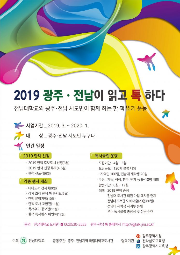 [아시아경제 호남취재본부 김육봉 기자] 전남대학교(총장 정병석)은 광주전남 시·도민과 함께 하는 한 책 읽기 운동 ‘광주·전남이 읽고 톡(talk) 하다’ 사업을 진행한다고 3일 밝혔다.