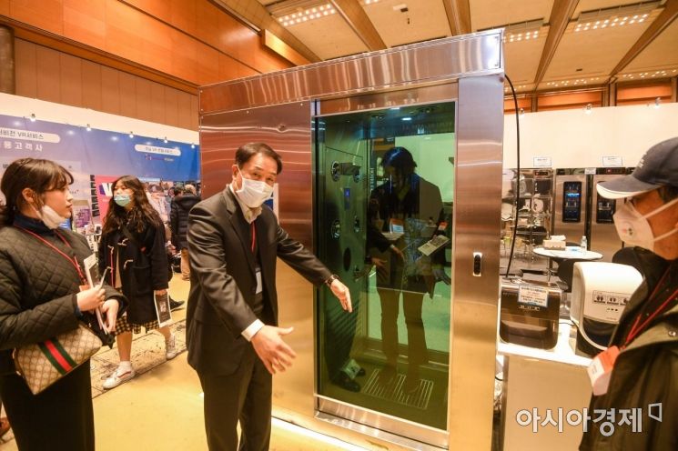 12일 서울 강남구 코엑스에서 열린 '2020 호텔페어'에서 관람객들이 클린 에어샤워기를 체험하고 있다./강진형 기자aymsdream@