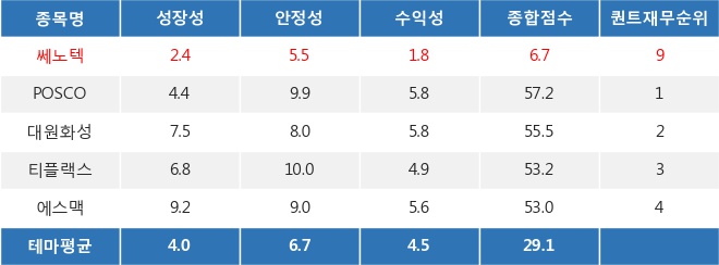씽크풀 로보알고리즘 RASSI의 분석에 따르면, 쎄노텍 의 퀀트 재무 점수는 6.72점으로 희귀금속(희토류 등) 관련 다른 종목 평균 보다 안정성과 수익성, 성장성 점수가 모두 낮은 편이다. 이는 재무적 측면에서 쎄노텍 이 다른 종목 대비 투자 매력도가 그다지 높지 않다는 것으로 해석될 수 있다. 반면에 POSCO은 다른 종목 평균 대비 높은 성장성과 안정성, 수익성 점수로 퀀트 재무 순위 1위를 차지했다.
