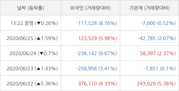 오늘 외국인은 를 11만 7528주 순매도 하고 기관은 7000주 순매도 하는 것으로 잠정 집계되고 있다. 최근 5일 동안 개인 투자자들은 46만 7457주 순매도 했고, 외국인과 기관은 각각 20만 726주 순매수, 22만 5036주 순매수 했다.