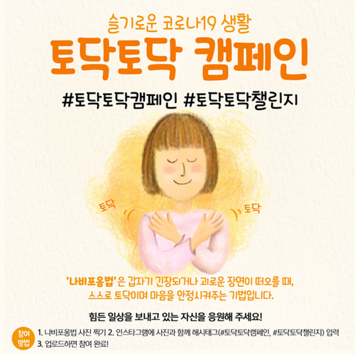 토닥토닥 캠페인은 심리 안정화기법 중 스스로를 안아주고 다독여주는 ‘나비포옹법’ 동작을 통해 코로나19로 힘든 일상을 보내고 있는 자기 자신을 격려하고 응원하는 자기돌봄 온라인 캠페인이다.