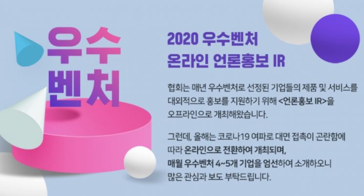 김진형 벤처기업협회 상근부회장은 "코로나19로 인한 언택트 마케팅이 필수요소가 되면서 벤처기업의 우수성을 널리 알리고자 온라인 '우수벤처 언론홍보' 행사를 개최하게 됐다"며 "우수 벤처기업의 대외홍보를 다각도로 지원할 예정"이라고 말했다.