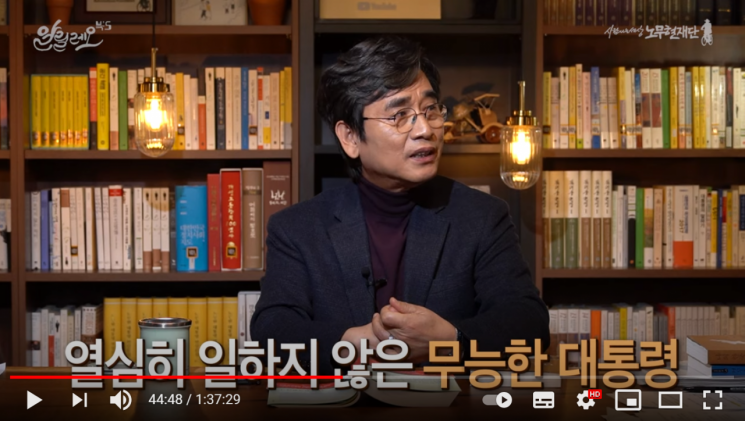 29일 유 이사장은 노무현 재단 유튜브 방송 '알릴레오 시즌3'에서 자신의 책 '나의 한국사'를 다루면서 "이승만 전 대통령은 대통령을 하기에 자격은 큰 하자는 없으나, 열심히 일하지 않은 무능한 대통령"이라고 평가했다.