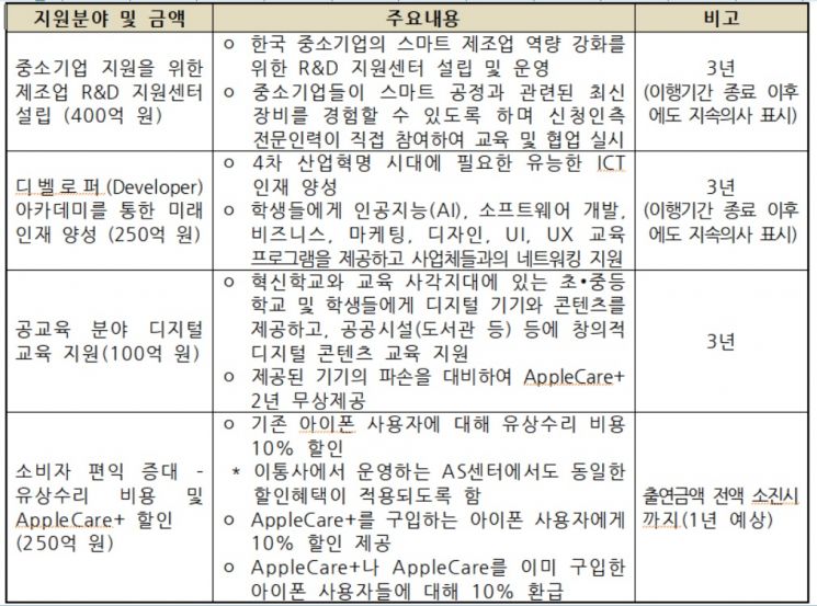 애플은 총 1000억원 규모의 상생안을 내놨다. 우선 250억원을 들여 출연기금이 소진될 때까지 아이폰 사용자를 대상으로 유상 수리비용을 할인하고, 애플케어플러스(보험) 서비스를 할인 또는 환급할 예정이다. 아이폰 이용자에게 인당 2~3만원의 혜택이 돌아갈 것으로 예상된다. 제조 분야 중소기업들을 대상으로 제조업 R&D 지원센터를 설립해 다양한 프로그램을 운영하고(400억원) 디벨로퍼 아카데미를 설립, 연간 약 200명의 교육생을 선발해 9개월간 교육 프로그램도 제공하기로 했다(250억원). 또 혁신학교, 교육 사각지대 및 공공시설 등에 디지털 교육을 지원할 방침이다(100억원).