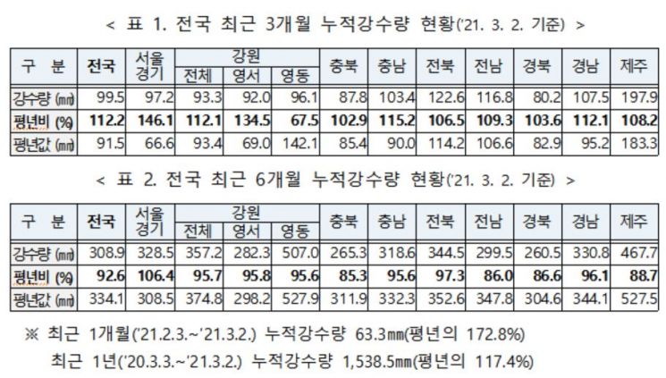 행안부에 따르면 최근 6개월 누적강수량은 평년(334.1㎜)의 92.6% 수준인 308.9㎜, 3개월 누적강수량은 평년(91.5㎜)의 112.2%인 99.5㎜로 평년과 비슷한 수준으로 나타났다. 5월까지의 강수량도 평년과 비슷할 것으로 전망했다.