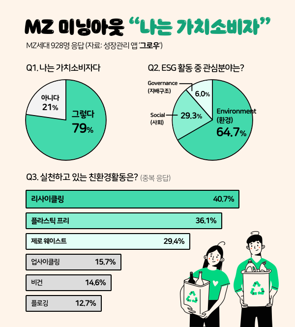 29일 성장관리 앱 그로우는 MZ 세대 928명을 대상으로 진행한 '가치소비'에 대한 설문조사 결과를 발표했다.