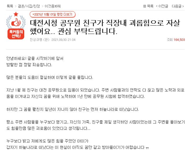 글쓴이는 "지난 1월 제 친구는 대전시 공무원으로 임용이 되었다"라며 "주변 사람들과의 연락도 다 끊고 많은 노력과 외로움을 이겨내며 자신의 꿈을 위해 노력하여 1년 만에 공무원 시험에 합격하였다"라고 운을 뗐다. 이어 "그 꿈을 펼친 지 일 년이 지나지 않아 친구는 먼저 하늘나라로 떠났다"고 호소했다.
