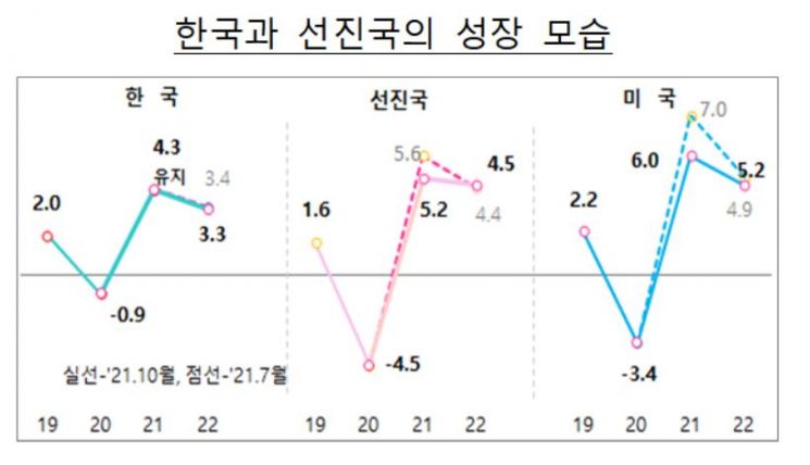 판단 배경과 관련해서는 백신접종률 확대, 수출 증가세, 추가경정예산 집행효과 등을 지목했다. 코로나19 충격에 따른 역성장의 기저영향을 제거한 2020~2021년 평균성장률은 1.7%로 G7 주요국인 미국(1.3%), 캐나다(0.2%) 독일(-0.7%), 프랑스(-0.9%), 일본(-1.2%), 영국(-1.5%), 이태리(-1.6%)를 큰 폭으로 상회했다. 2020년~2022년 3년 평균성장률은 2.2%로 미국(2.6%)에 이어 2위를 나타냈다. 선진국 평균은 1.7%다.