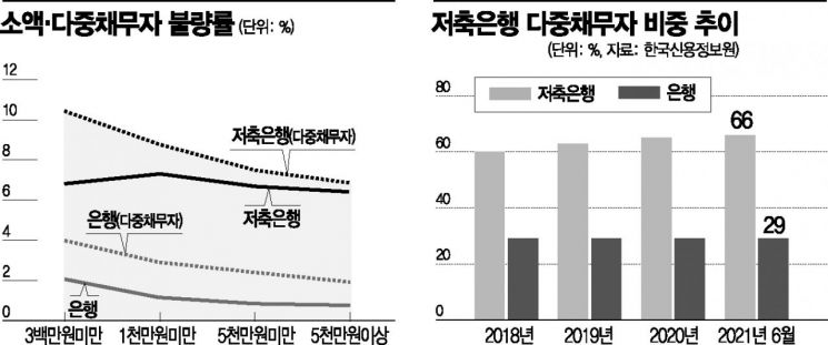 문제는 저축은행 다중채무자가 갈수로 늘어난다는 점이다. 2018년 60%였던 저축은행 다중채무자 비중은 올 상반기 기준 66%로 불어났다. 29%로 매해 일정하게 유지되는 은행권과 대조적이다. 특히 소액신용대출자(300만원 미만) 비중이 10%로 은행권(3%)의 3배에 달해 각별한 리스크 관리가 필요하다는 지적이 나온다.