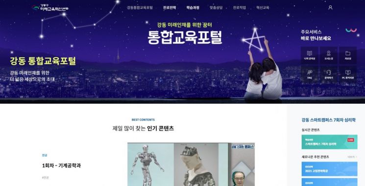[아시아경제 박종일 기자] 강동구(구청장 이정훈)가 미래교육 패러다임을 반영한 통합교육포털 ‘강동 미래온’을 구축, 다양한 온라인 교육 서비스를 제공하고 있다고 밝혔다.