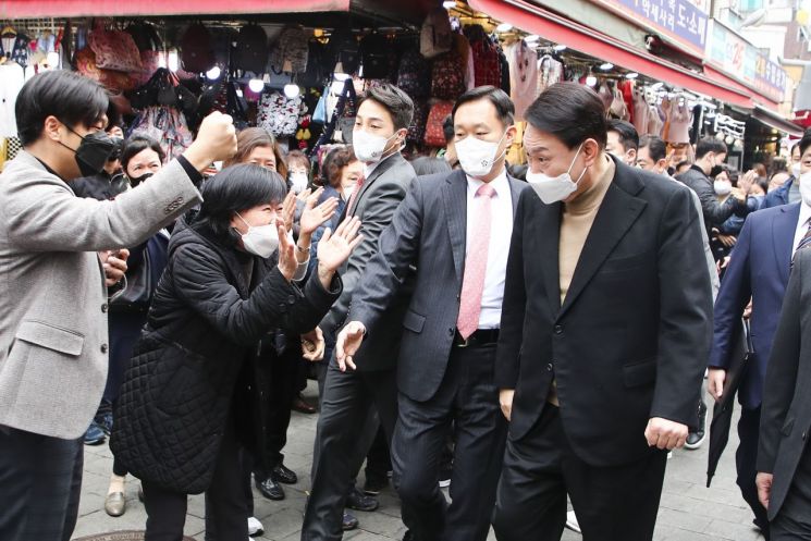 [아시아경제 금보령 기자, 권현지 기자] 윤석열 대통령 당선인이 14일 당선 이후 첫 외부 공식일정으로 전통시장 상인들을 만났다. 코로나19로 큰 피해를 입은 소상공인·자영업자들을 위로하고, 이들을 위한 정책에 힘을 쏟겠다는 의미로 풀이된다.