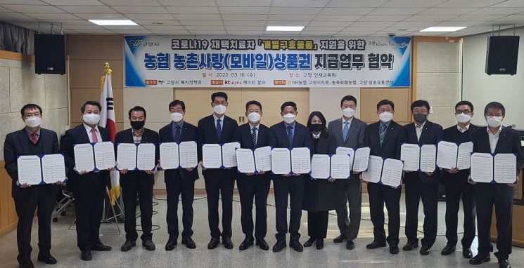 KT알파는 지난 15일 고양시, NH농협 고양시지부와 코로나19 개별구호물품 지원을 위한 업무 협약을 맺고 관내 코로나19 재택치료자의 안정적인 격리생활과 최소한의 생활유지를 위해 ‘농촌사랑 모바일 상품권’ 지급 및 발송을 지원키로 했다. 재택치료자 1인당 3만5000원에 해당하는 상품권이 지급된다.