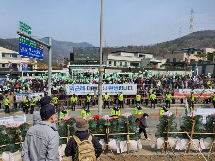아침 일찍부터 하얀색 연두색 초록색 풍선을 든 시민과 지지자들이 거리 곳곳에서 박 전 대통령을 만나기 위해 몰려들었다.