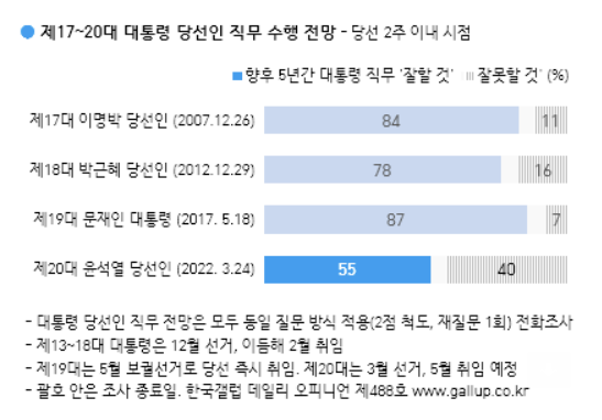 25일 여론조사기관 갤럽이 공개한 여론조사에 따르면 향후 5년간 윤 당선인이 국정을 잘 이끌 것이라고 응답한 이는 전체 응답자의 55%였고, 잘못할 것이라고 응답한 이는 40%였다. 국민의힘 지지층(90%)이나 성향 보수층(80%), 대구·경북(75%) 등의 경우 윤 당선인의 국정 수행에 대한 기대치가 높았다. 반면 더불어민주당 지지층(72%)이나 진보층(73%), 40대(59%) 등의 경우에는 잘못할 것이라는 전망이 우세했다.