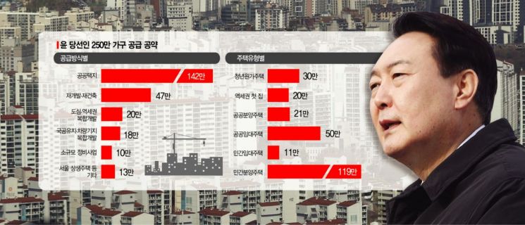 윤 당선인은 앞서 ▲공공택지 142만 가구 ▲재개발·재건축 47만 가구 ▲도심·역세권 복합개발 20만 가구 ▲국공유지·차량기지 복합개발 18만 가구 ▲소규모 정비사업 10만 가구 ▲서울 상생주택 등 기타 13만 가구 등 총 250만 가구 공급을 공약했다. 주택 유형별로는 ▲청년원가주택 30만 가구 ▲역세권 첫집 20만 가구 ▲공공분양주택 21만 가구 ▲공공임대주택 50만 가구 ▲민간임대주택 11만 가구 ▲민간분양주택 119만 가구다.