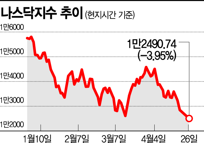 이는 빅테크 실적 시즌에 대한 경계감이 장중 내내 이어지며 매도세가 커진 탓으로 분석된다. 자칫 넷플릭스처럼 성장 기대감이 꺾이며 하루새 주가가 35% 폭락하는 사태가 재연될 수 있다는 우려다. MS와 알파벳은 각각 3.74%, 3.59% 하락했다. 애플(-3.73%)·메타(-3.23%)·넷플릭스(-5.48%) 등도 줄줄이 미끄러졌다.