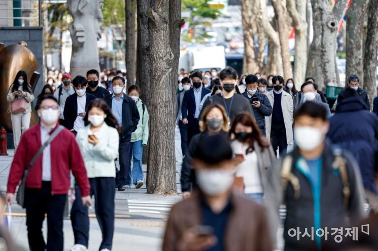 정부가 2년1개월만에 사회적 거리두기를 전면해제하기로 결정한 지난 15일 서울 강남구 테헤란로에서 직장인들이 마스크를 착용하고 출근길에 오르고 있다./강진형 기자aymsdream@