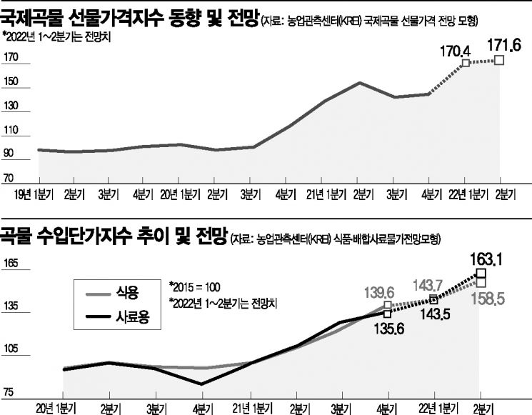 세계은행도 지난 26일 공개한 원자재 시장 전망 보고서에서 우크라이나 전쟁으로 올해 세계 식량 가격이 22.9% 오를 것이라고 예상했다. 한국농촌경제연구원(농경연)에 따르면 국제곡물 선물가격지수는 지난 1분기 170.4로 1년 전 같은 기간에 비해 19.2% 폭등했다. 오는 2분기에는 2012년 3분기 이후 약 10년 만에 역대 최고치를 경신할 것으로 전망되고 있다.