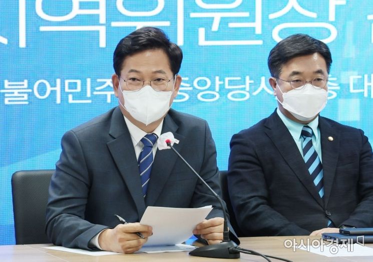 송영길 더불어민주당 서울시장 후보가 4일 서울 여의도 중앙당사에서 열린 서울지역 49개 지역위원장과의 간담회에 참석, 인사말을 하고 있다./윤동주 기자 doso7@