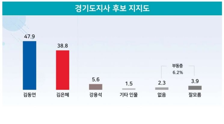 [아시아경제 오주연 기자] 6·1 지방선거에서 김동연 더불어민주당 후보를 차기 경기도지사로 지지한다는 비율이 김은혜 국민의힘 후보보다 높은 것으로 나타났다.
