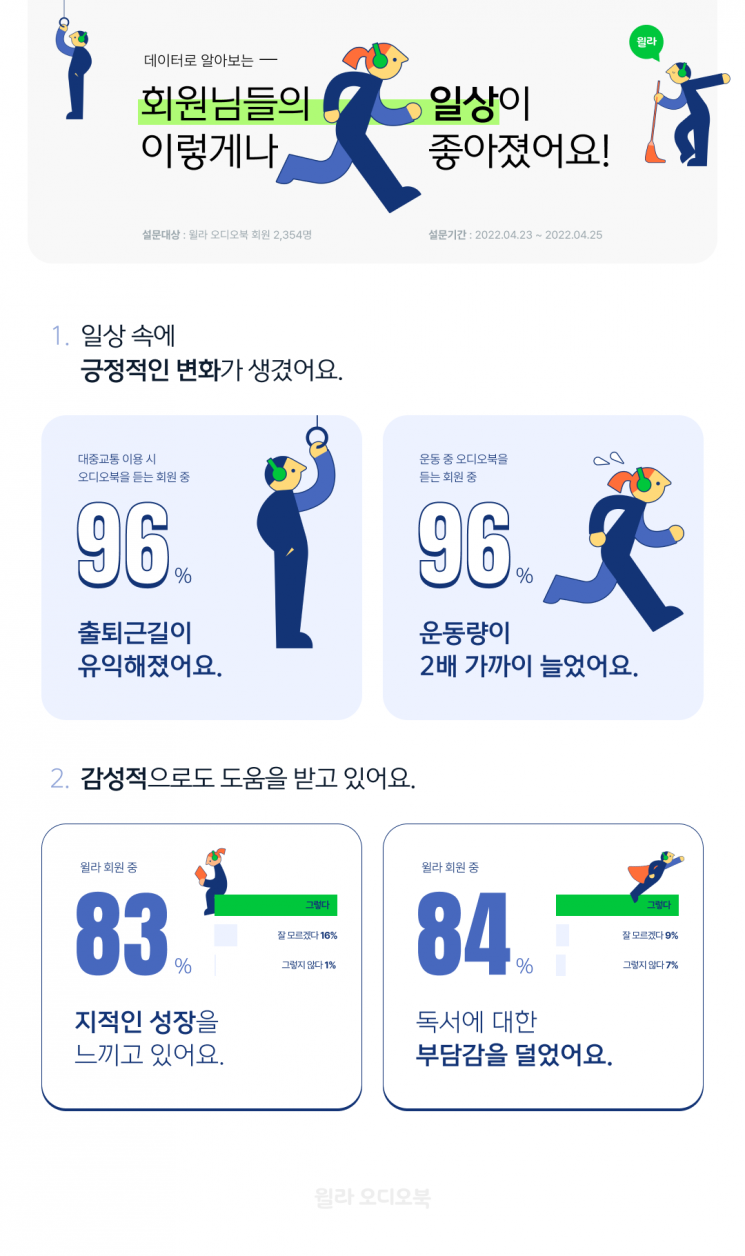 오디오북 구독 서비스 윌라는 지난 10일 오디오북이 일상생활에서 나타나는 효과에 관한 내용을 다룬 설문조사 결과를 발표했다. 지난 4월22일부터 25일까지 나흘간 자사앱 이용 고객 2354명을 대상으로 진행한 설문에서 ▲운전 중 효과 ▲출퇴근 중 콘텐츠 소비 효과 ▲운동 중 효과 ▲집안일 중 효과 등 다양한 긍정적인 영향을 확인했다.
