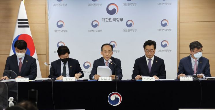 추경호 경제부총리 겸 기획재정부 장관이 12일 정부서울청사 브리핑실에서 열린 2022년 2차 추가경정예산안 관계장관 합동브리핑을 하고 있다. 왼쪽부터 조주현 중소벤처기업부 차관, 최상대 기획재정부 2차관, 추경호 부총리, 정황근 농림축산식품부 장관, 조규홍 보건복지부 1차관. [이미지출처=연합뉴스]