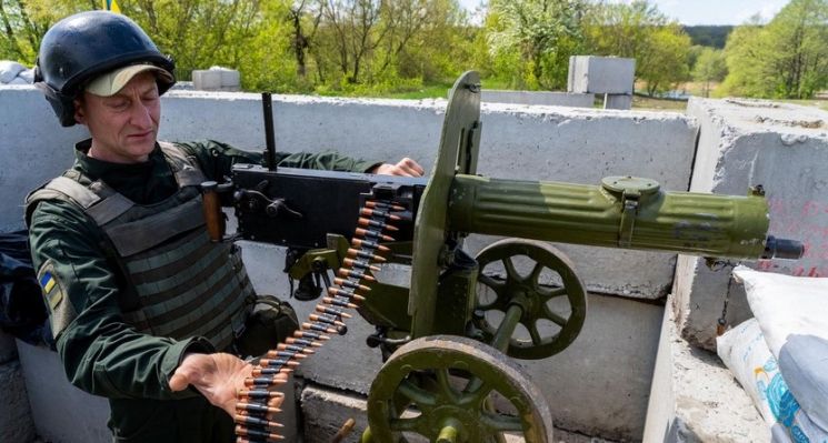 지난 3월, 우크라이나 돈바스 지역을 방어하는 우크라이나군 병사가 1910년 제작된 맥심기관총의 M1910 기종을 배치하는 모습. [이미지출처= 우크라이나군 트위터]