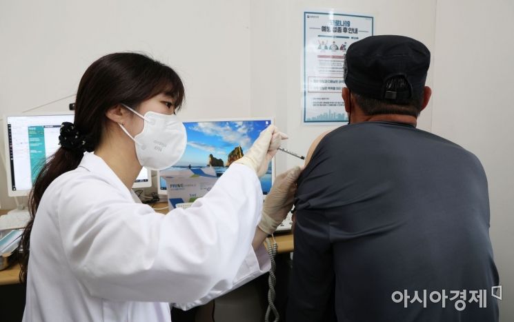 60세 이상 사전예약자에 대한 코로나19 4차 예방접종이 시작된 25일 서울 강서구 부민병원에서 한 시민이 백신을 접종하고 있다. 2022. 4. 25 사진공동취재단