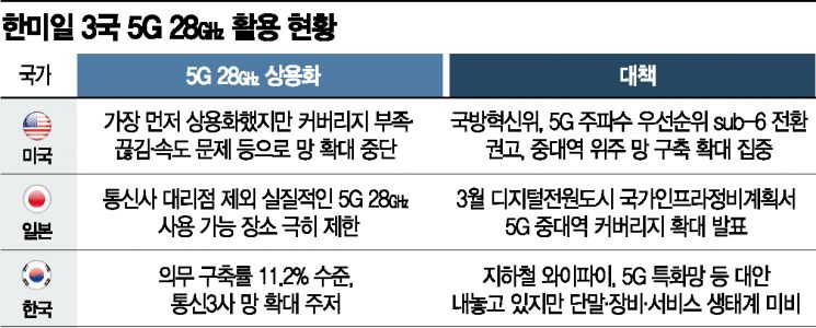 28㎓ 주파수 대역 활용 고민은 비단 한국만의 문제는 아니다. 5G 최초 상용화에서 한국에 밀린 미국은 28㎓ 대역을 최초로 상용화했지만 정책 실패를 인정하고 중대역(C-밴드) 개발에 다시 초점을 맞춘 5G 정책을 설계했다. 좁은 커버리지와 잦은 끊김 등 28㎓ 활용에 따른 제약으로 실제 활용성이 떨어졌기 때문이다. 일본은 통신사 대리점 등을 중심으로 28㎓ 기지국을 구축했지만 사용 가능한 장소가 극히 제한돼 있어 활용도가 낮다. 일본 역시 정책 실패를 인정하고 지난 3월 국가인프라정비계획을 통해 5G 중대역 커버리지 확대 계획을 발표했다.