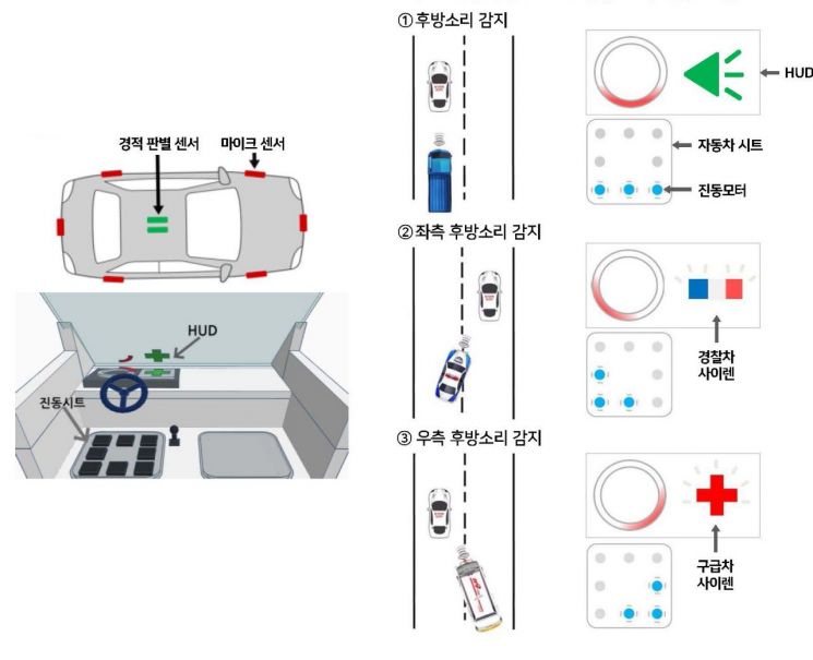 시스템은 LED뿐만 아니라 운전자 좌석에 설치한 8개의 진동모터로 소리가 난 방향에 진동도 주도록 설계됐다.