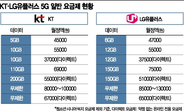 1일 통신업계에 따르면 KT와 LG유플러스는 데이터 제공량 20~30GB 사이 복수 요금제 출시 방안을 고민 중이다. SK텔레콤이 24GB를 월 5만9000원에 제공하겠다고 밝힌 만큼 5만원대에서 이보다 많은 데이터를 제공하는 상품을 내놓을 것이란 기대가 높다. 일각에선 30GB를 6만원대에 제공하는 방안을 고민 중이란 전망도 나오고 있다.