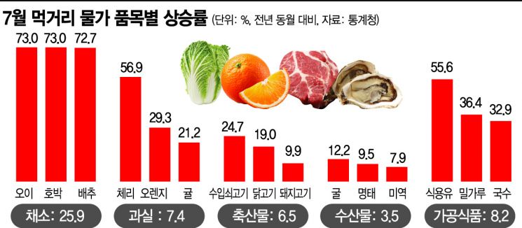 먹거리 품목 151개의 평균 물가 상승률은 12.0%에 달했다. 폭염·장마철에 따른 작황 이상으로 채소는 25.9% 뛰었고, 과실(7.4%), 축산물(6.5%), 수산물(3.5%), 가공식품(8.2%)도 일제히 올랐다. 수요 대비 생산량이 많아 가격이 폭락한 쌀을 중심으로 곡물 가격만 11.9% 내렸다.